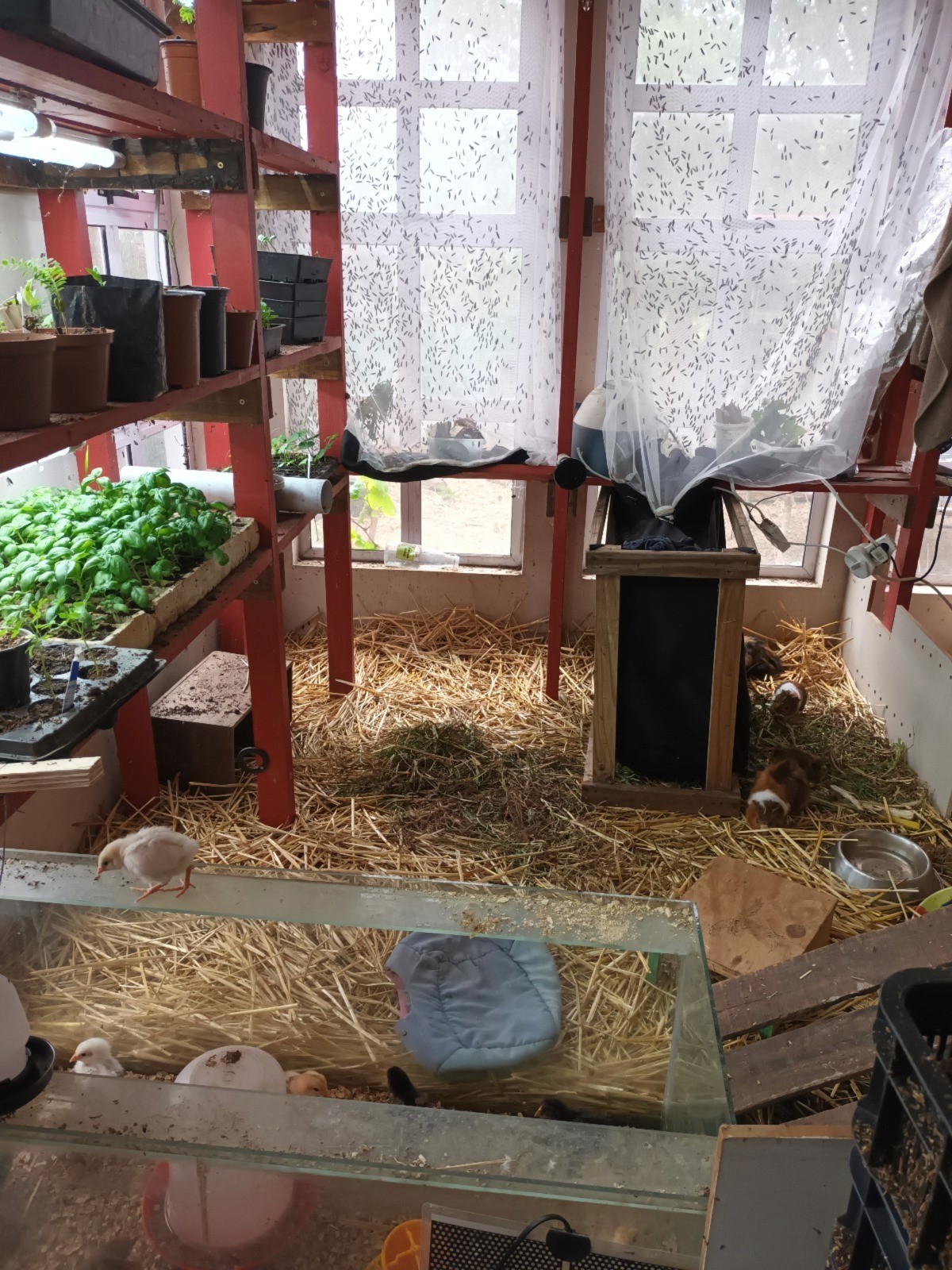 BSF need light, warmth and humidity to lay eggs. So we have integrated our breeding area with the warm, light environment for raising our chicks and our seedlings.
